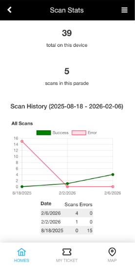Scan Stats shows the entire event scans history, as well as the home scan data connected to your builder account.