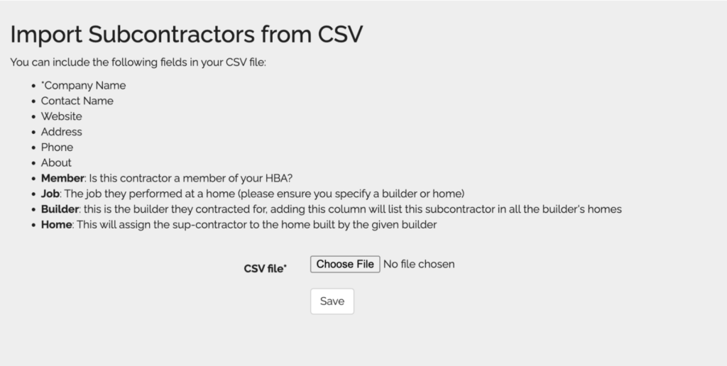 Any client can add subcontractors individually or upload a CSV File of subcontractor information.