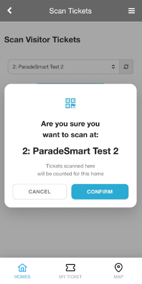 If you have more than one home in your account, you will need to select the correct home in the dropdown before scanning a ticket. Press confirm and begin scanning.