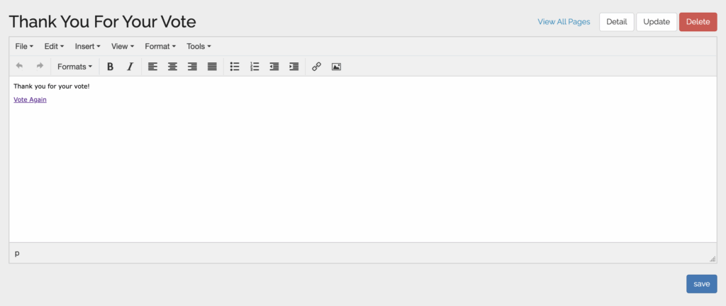 A voting confirmation page will show after someone successfully submits a vote. If you choose not to set one up, the visitor will see a simple confirmation sentence.