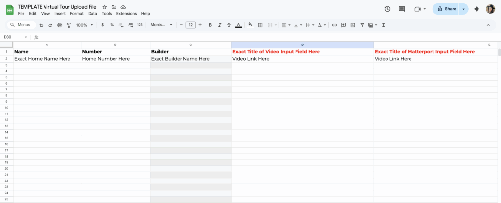 Your spreadsheet is now ready for Virtual Tour hyperlinks. Please visit the Adding & Removing a Virtual Tour Guide to format your hyperlinks correctly and learn the uploading process.
